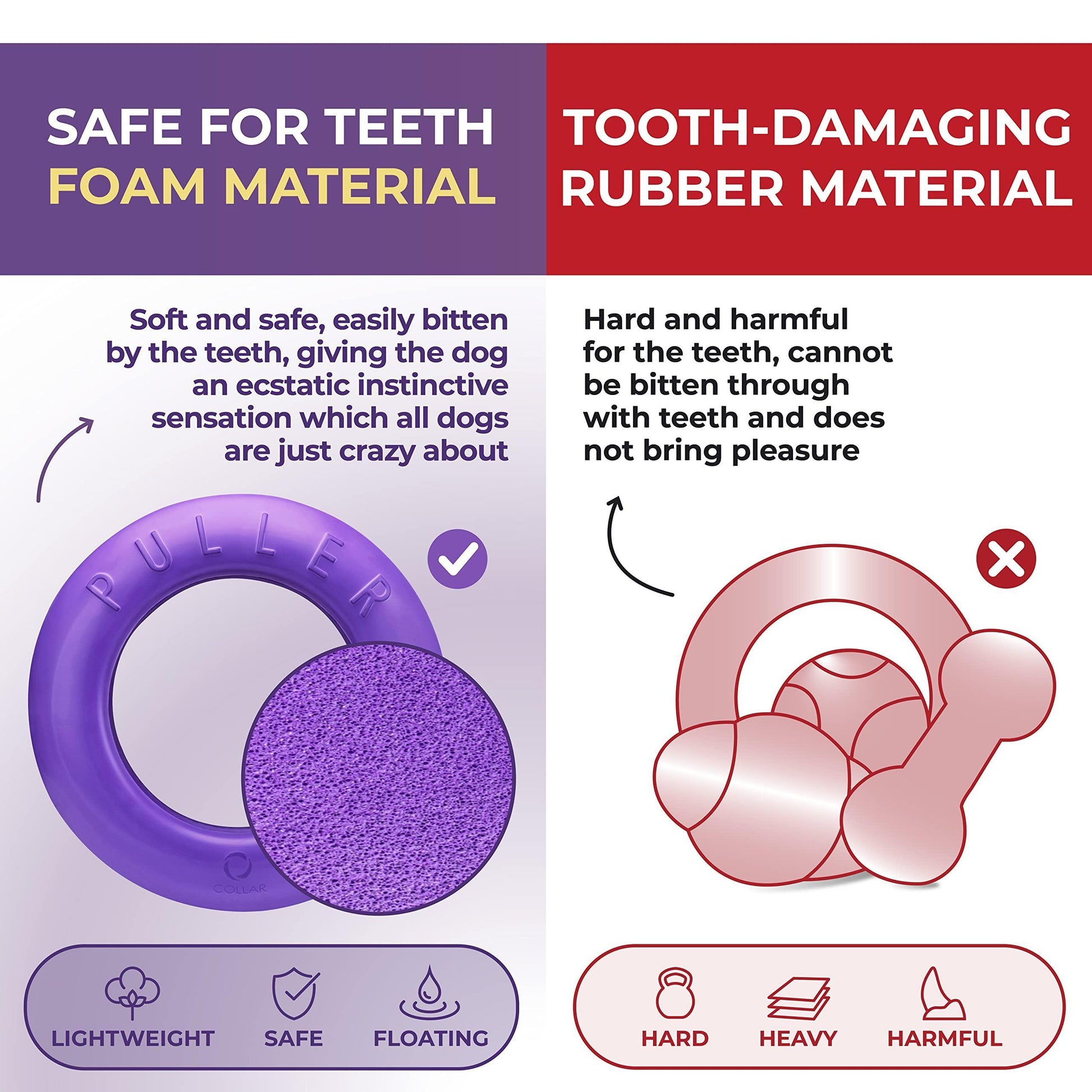 Safe for Teeth Unique Material - PULLER is soft enough and the dog does not injure the teeth and jaws when biting. PULLER is made of non-toxic and odorless material. Thus, the dog focuses on the game but not on the smell.