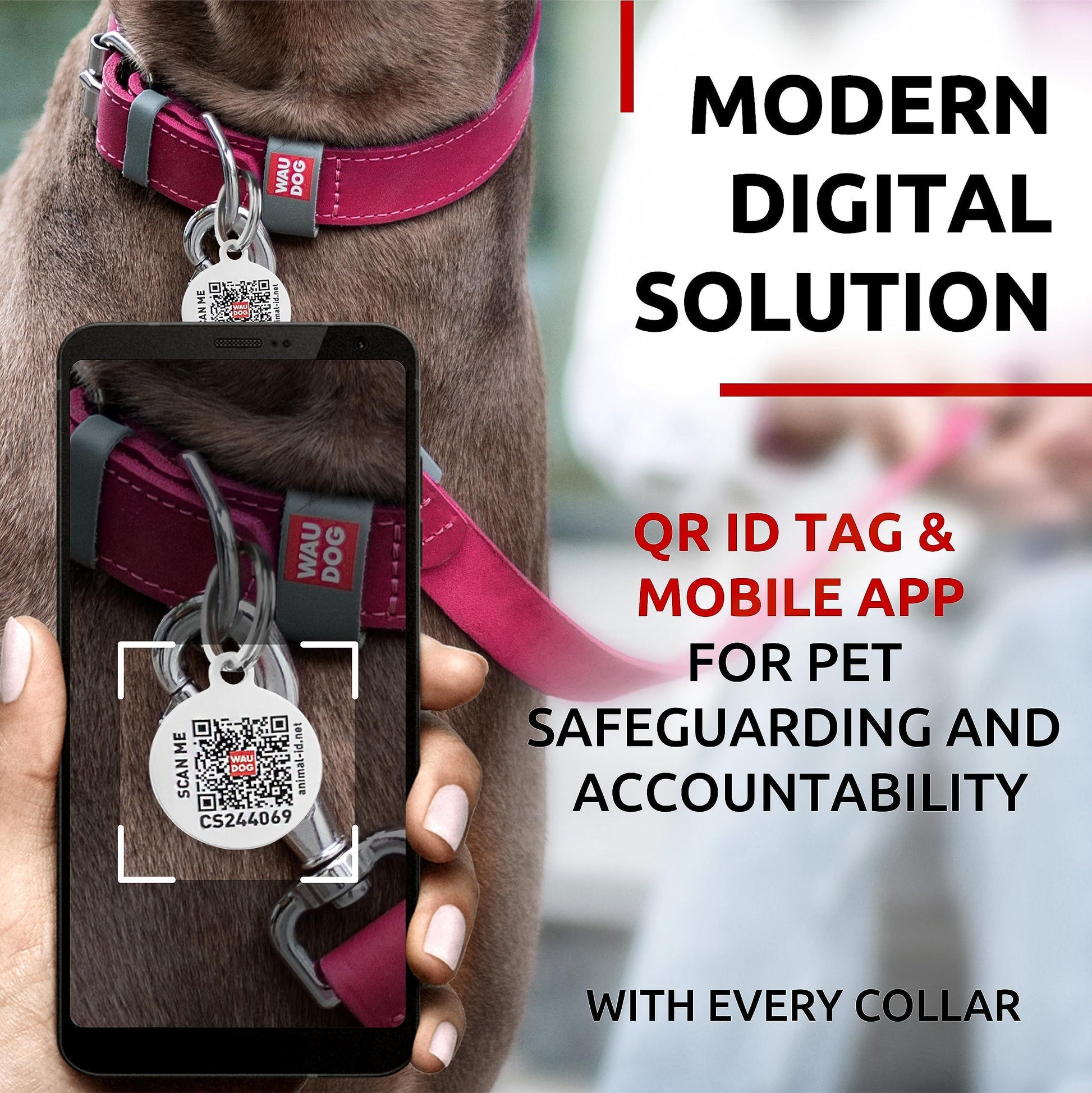 SMART QR TAG - A modern digital solution designed to enhance your dogs safety. The collar tag contains a QR code which connects to a multifunctional mobile app.